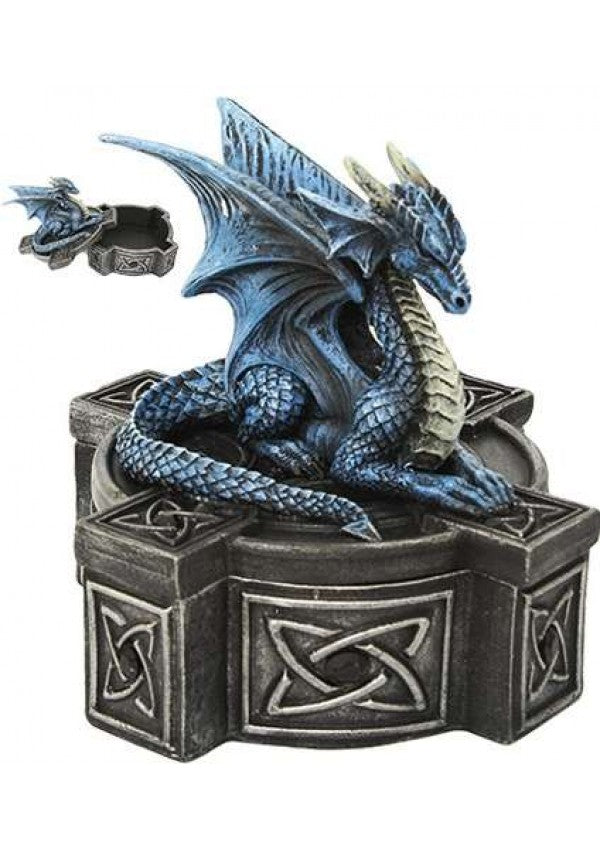 A blue winged dragon rests on his treasure - a stunning crossed shaped box with lift-off lid.