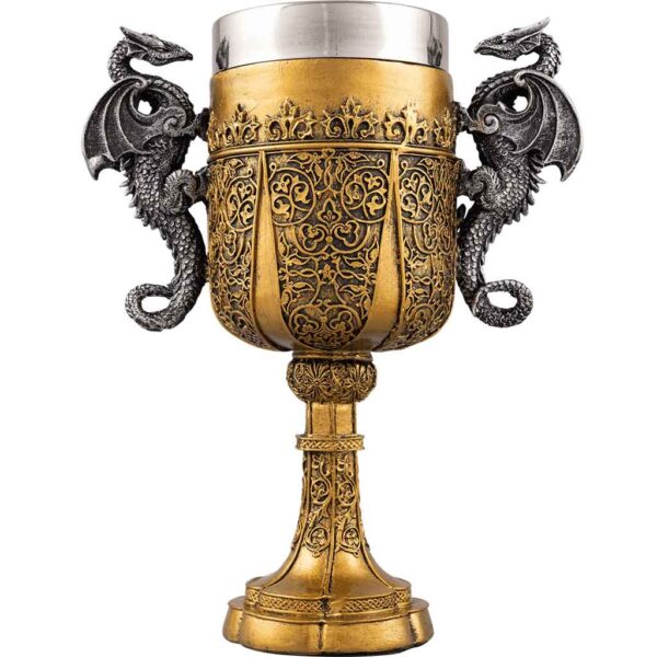 Hand painted to look like an ancient golden cup, the Double Dragon Chalice is a magnificent medieval drinkware choice. The cast resin stemmed drinking cup features two highly detailed dragons on each side in dark metallic silver. Ornate vine filigree decorates the main portions of the cup and stem, and each attached dragon figure has stylized spiral wings paired with realistic scales. The dragons mirror each other, both gazing inwards towards the fantasy goblet. A stainless steel insert makes this antique golden goblet safe for drinking from, making it an excellent choice when setting the table for your next medieval feast.