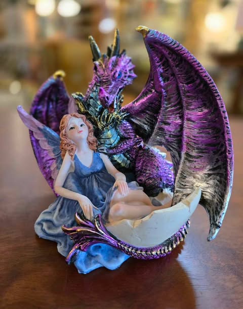 "Metallic Pink Guardian Dragon and Blue Fairy Figurine – A mesmerizing 7x7x5-inch collectible featuring a radiant metallic pink dragon protectively curled around a serene blue fairy seated within a delicate eggshell. Priced at $35.00, this enchanting piece is a must-have for fans of fantasy art and whimsical decor."