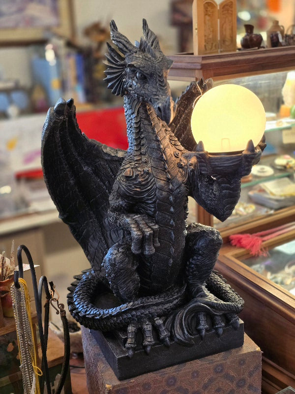 The Obsidian Seer holds court in darkness, clutching a glowing orb of prophecy. Crafted in a matte-black stone finish, this stoic dragon is perched atop a stylized pedestal with wings tucked and claws wrapped around a frosted globe light. Whether you see it as a guardian, oracle, or arcane conduit, this piece radiates equal parts power and elegance.