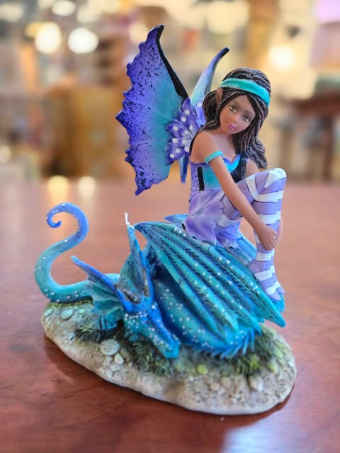 "Ocean Fairy with Baby Dragon Figurine – A captivating 5x5x4-inch piece featuring a serene fairy adorned in oceanic hues, sitting gracefully beside her baby dragon companion. Beautifully detailed, this $55.00 collectible brings fantasy to life and is perfect for any fairy or dragon enthusiast."
